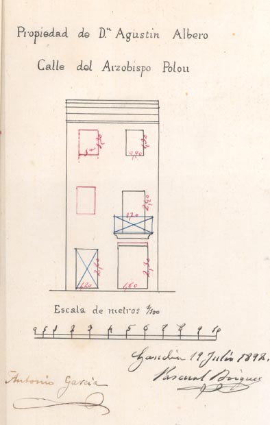 El segon expedient de reforma de façana correspon a la casa propietat d’Agustí Albero. Com veiem detalladament al plànol, les reformes que vol realitzar el senyor Albero estan dibuixades amb tinta roja, mentre que l’obra que ja existeix es dibuixa en tinta negra. En paraules del propietari, demana