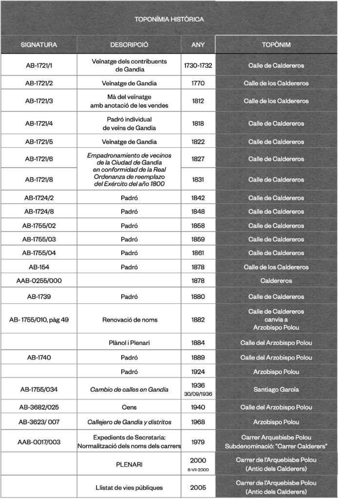 El 1880 es canvia el nom de carrer dels Calderers que tenia una clara motivació popular, un significat i un arrelament conservat durant segles, per rebatejar el carrer amb el nom d’un eclesiàstic, l’arquebisbe Polou, que dubte que cap gandià d’aleshores o d’ara sàpia dir-nos qui és.