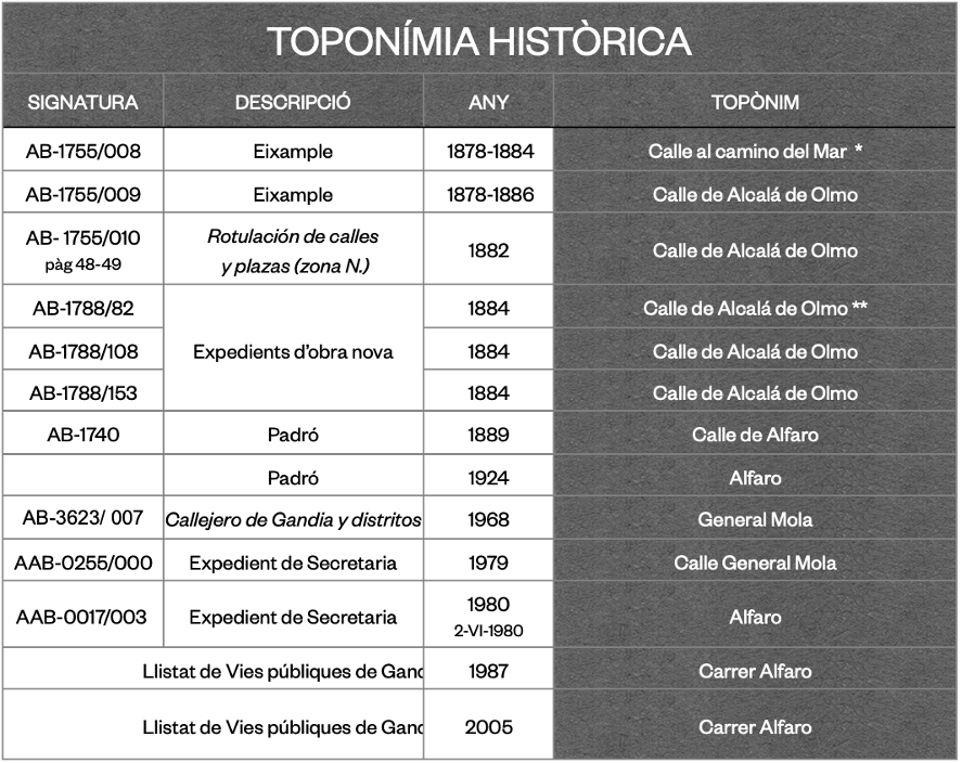 El procediment en la selecció de noms del carrer ens fa intuir com fou avançant l’obra de l’eixample de l’estació i, a la vegada, com coneixien els gandians les seues terres i els seus propietaris. Un carrer primerament dedicat a un homenot gandià (Alcalà de Olmo) va canviar de nom ràpidament per anomenar-se carrer Alfaro. Per què?