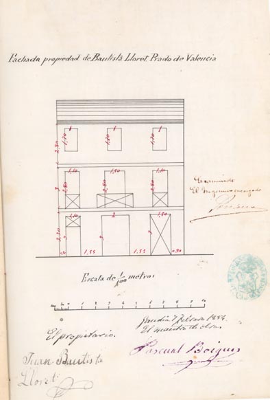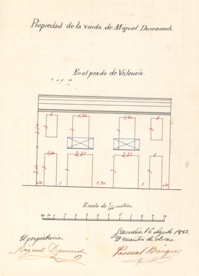 Les primeres construccions que trobem són de l’any 1883, en concret tres expedients de propietaris que es refereixen uns a les obres dels altres per poder ubicar concretament la seua parcel·la. Així, la senyora vídua de Miguel Doménech ens diu que la seua casa està “al linde de D. Salvador Codoñer i José Alcoyá” (AB-1787/131, de 1883). Al temps, el senyor Salvador Codoñer ens diu que vol construir una altra casa “en el Prado de Valencia, al linde con otra casa de su propiedad” (AB-1787/129).