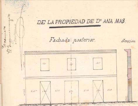 Un any després dels permisos de totes aquestes construccions, l’any 1885, trobem l’edificació de la senyora Ana Mas. Aquesta casa és molt peculiar perquè té una façana a l’actual número 43 de l’Avinguda d’Alacant i la posterior al carrer Alfaro, 42. Serà rellevant, com hem dit, aquesta construcció, perquè els propietaris de la Ford, en la construcció de l’edifici de la T.A.S.A. hi incorporaran part d’aquesta casa de la senyora Mas, que els vendrà una part de la façana que recau al carrer Alfaro. Els plànols de la casa que va construir la senyora Ana Mas són els que podem trobar a l’expedient AB-1788/108: