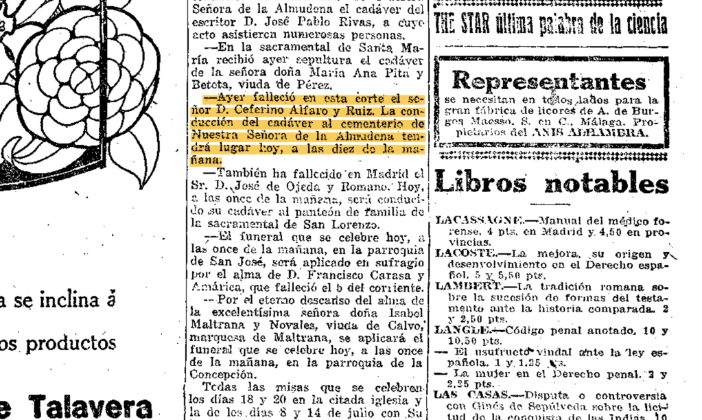 Aquest edifici, fotografiat entre 1915 i 1920, és on visqué a Madrid el senyor Alfaro. Ubicada concretament al número 62 del carrer de Velázquez. Sabem quan va morir perquè trobem una necrològica a la publicació madrilenya El Sol, del 17 de juny de 1919, on es fa la següent ressenya: