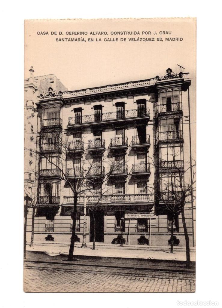“CASA DE D. CEFERINO ALFARO, CONSTRUÏDA POR J. GRAU / SANTAMARÍA, AL CARRER DE VELÁZQUEZ 62, MADRID” (anvers), ” FOTOTÍPIA DE HAUSERY MENET.- MADRID” (revers)Cartolina blanc i negre14 x 9 cmTipus: Targetes postalsNúm Inventari: 1990/9/16.