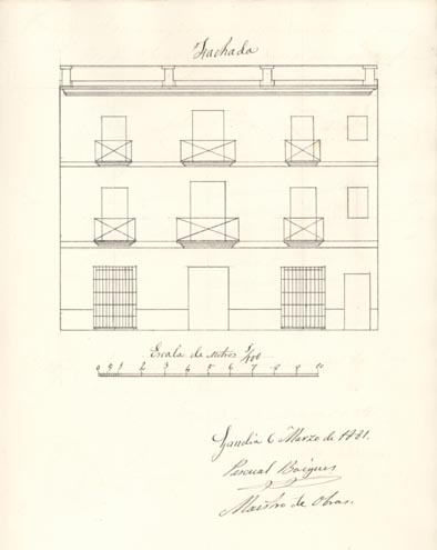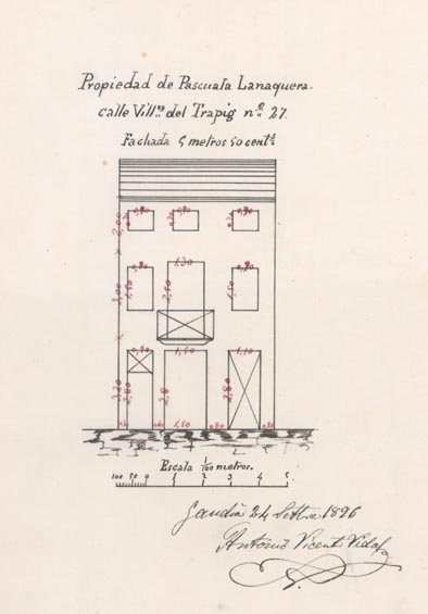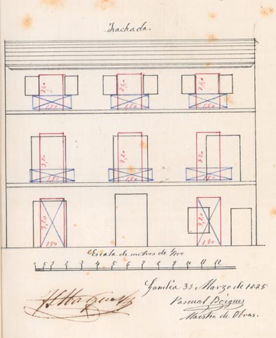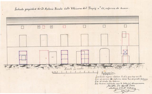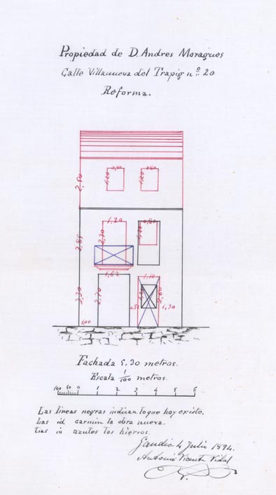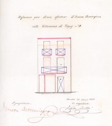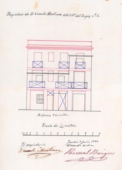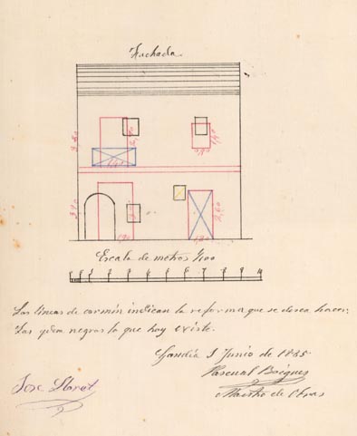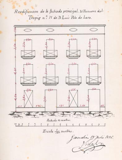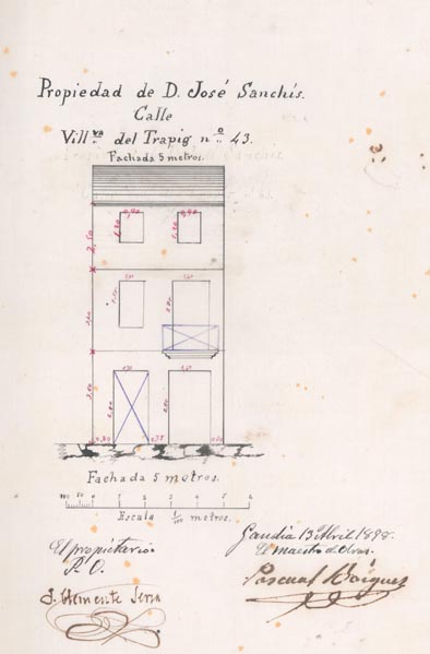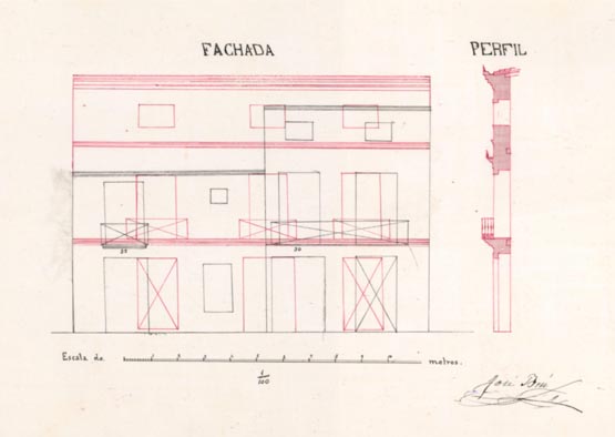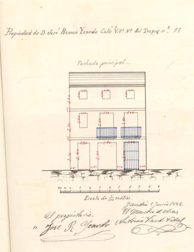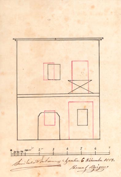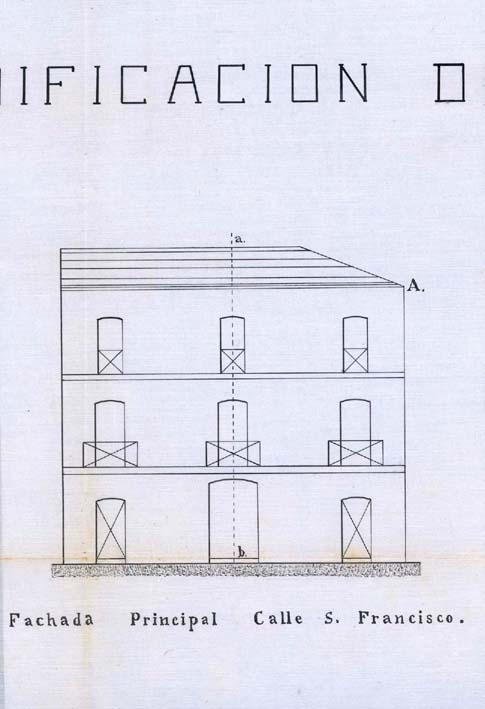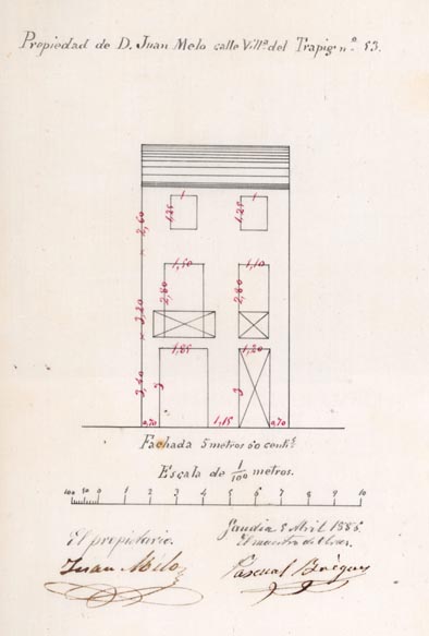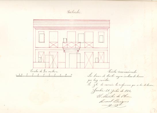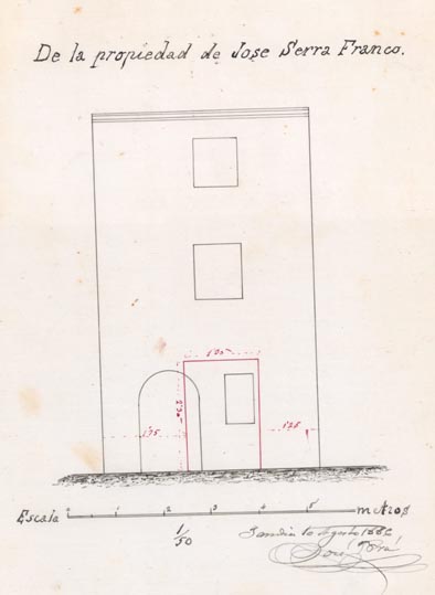 AB-1787/108 (1883) : “(…) colocar solera en la puerta de entrada quitando el arco hoy existente dando mayor elevación en la fachada principal”.