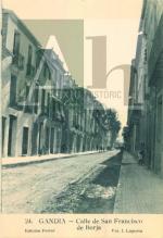La importància d’aquest carrer augmentà amb el següent projecte d’Eixample de la ciutat de Gandia, en aquest cas amb l’enderrocament de les muralles per tal d’obrir la ciutat per la part sud, aquella que afectava al nou passeig de les Germanies i al Prado. A la imatge 2 veiem l’entrada del carrer Sant Francesc de Borja des del passeig de les Germanies, amb una font al davant, i al darrere a l’esquerre l’edifici de Foment. Potser els gandians ja han reconegut aquesta font. Es tracta de la font de pedra que ara està situada també al passeig de les Germanies, però a l’alçada del carrer Major. Es tracta realment d’una font viatgera, ja que el seu primer emplaçament fou a la plaça de les Escoles Pies. Finalment, en el moment d’obrir el carrer al nou passeig i donar-li una continuació amb el carrer Rausell fins al Prado, la font fou traslladada a aquest punt per ornamentar aquest nou i modern espai.