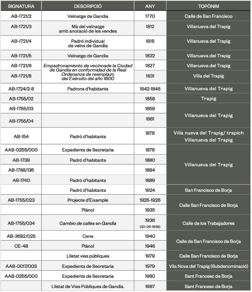 El nou traçat urbà que apareix amb l’ampliació del recinte emmurallat, que va manar fer el duc Francesc de Borja (s. XIV-XVI) popularment es coneixerà com a Vilanova, nom totalment justificat per la realitat que comportava. A la vegada, s’afegia el complement nominal “del Trapig”, que ens remet a l’existència en aquest lloc d’un molí de canya de sucre, conreu important a la zona en l’època de la creació del carrer.